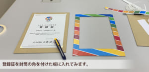 額縁を購入して、飾ろうと思いましたが、登録証交付式での北橋市長のご挨拶に「SDGsは、知る時代から実践する時代に移ります。」とありましたので、額縁を購入せずに捨てるもので作ってみました。