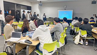3年生が中心となって参加した前半クールでは、市内の他大学の学生とともに3つのチームを作り、それぞれ「市の基本構想」「映画フェス」「広報PR」のテーマについて企画や調査を行いました。若者目線で北九州市をPRするショートムービーを作成して公開したり、北九州市主催で12月に開催された「北九州国際映画祭」に合わせて「MOVIE FESTIVAL」を企画運営したりと、活発に活動を行いました。また、若者目線で北九州市の未来を考えるワークショップでは、武内和久北九州市長の前でプレゼンを行う機会を頂き、その様子が「北九州市政だより」(2023年12月1日号)に掲載されました。