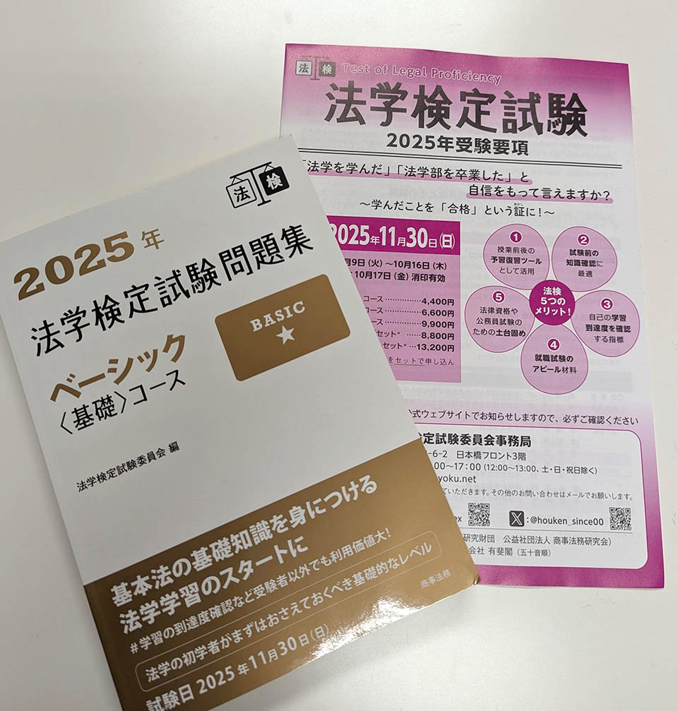 法学部では、今年度からスタートした「スーパー公務員養成プログラム」のファーストステップとして法学検定を推奨しています。また、本学で団体受験をおこなっています。法学検定の勉強を通じて勉強の習慣や方法を確立させて公務員試験の準備をしてもらえると嬉しい限りです。