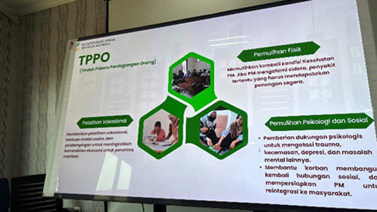 問題を抱えた子どもたちの保護施設について説明を受けた時のパワーポイント資料から。施設では、子どもたちの心身および社会的回復を図るとともに、社会復帰に向けた職業訓練が実施されている。2025年7月30日(筆者撮影)