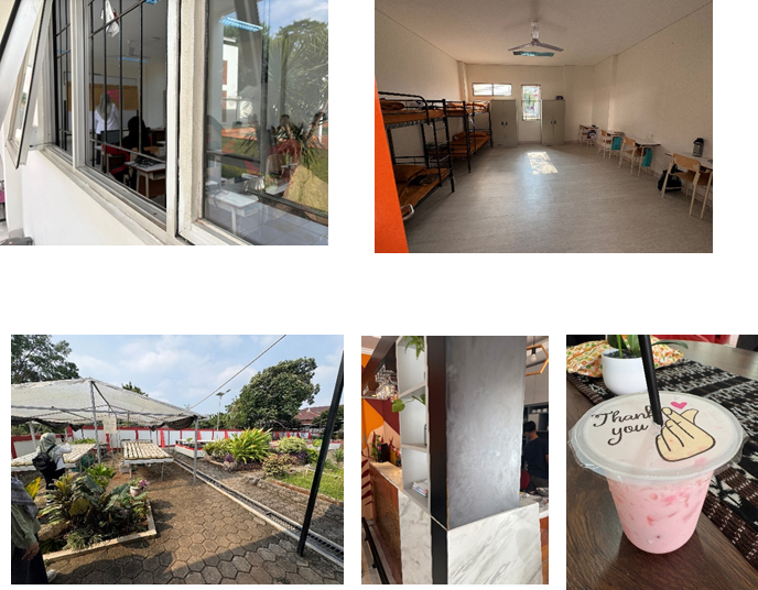 左上から順に、教室、宿舎、職業訓練兼自家栽培用の農園と釣り堀、園内カフェとそのドリンク。いずれも問題を抱えた子どもたちの保護施設内の様子で、プライバシー保護のため子どもたちの姿は写っていません。2025年7月30日(筆者撮影)