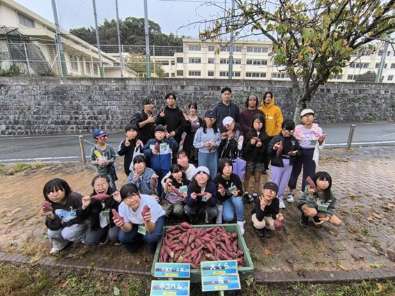 たくさん収穫できたお芋をまえに記念写真です。来月の「おおくらっ子11月」では、このお芋をつかって、大学生や地域のみなさんとスイーツをつくり、一緒に食べる予定になっています。いまから楽しみです!