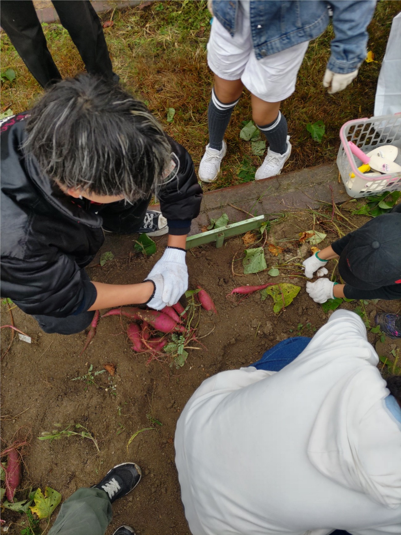いよいよ掘ります!「(蔓を引っ張っても)ちっちゃいお芋しかない!」とつぶやく子どもたち。そんなことありません!地域の方が大きなシャベルで土を柔らかくしてくださったあと、大学生のお兄ちゃんお姉ちゃんが手伝うと、大きなお芋をどんどん掘り出せるようになりました。