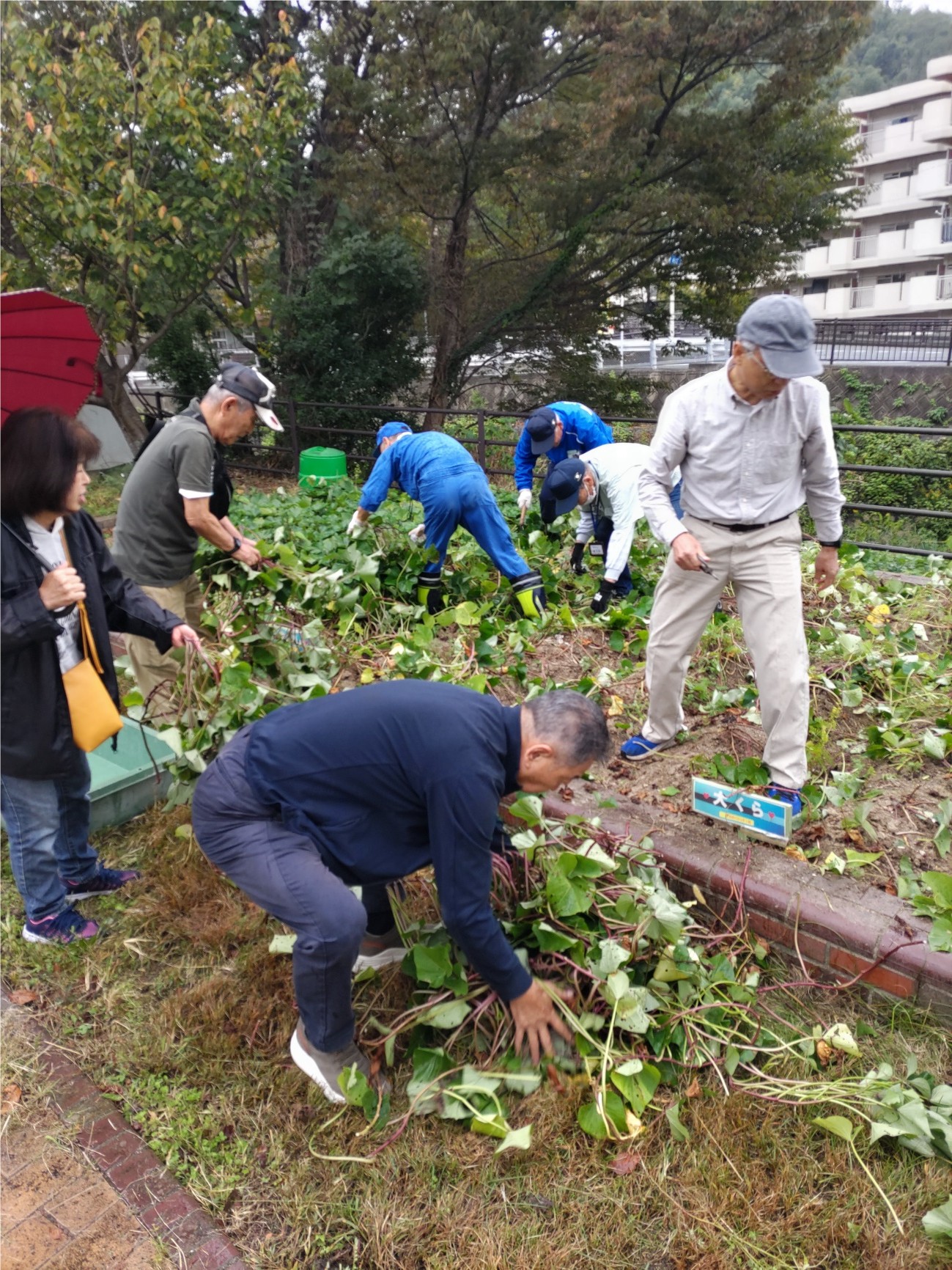 まずは地域の方が、生い茂ったさつまいもの蔓を刈り、子どもたちがスコップでほりやすいように整えてくださいました。