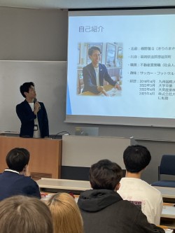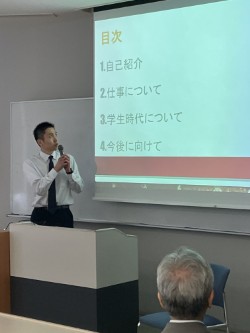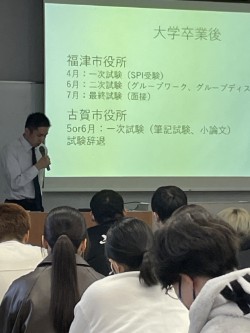 最初に登壇していただいたのは、J17期生の茅野龍一さん(菅尾ゼミ)です。現在、福津市役所に勤務されています。