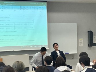 本学法学部の卒業生お二人をお迎えし、1年生に、仕事のことやかつての大学生活についてお話しいただきました。