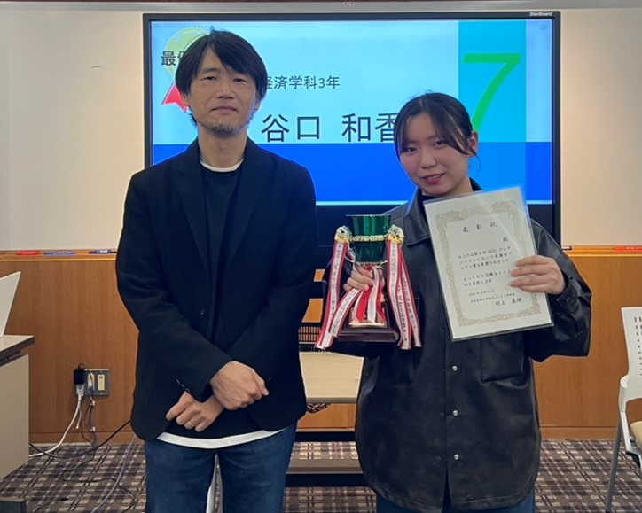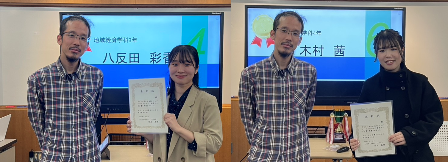 また、優秀賞には、村上ゼミナール観光マーケティングチーム・八反田 彩香さん(現代ビジネス学部地域経済学科3年)による「北九州市におけるインバウンドとSDGsの活用について」、くわはたゼミ絵本班・木村 茜さん(現代ビジネス学部地域経済学科4年)による「八幡の絵本を作ろう!プロジェクト」が選ばれました。受賞者3名には、それぞれ賞状と副賞が授与されました。