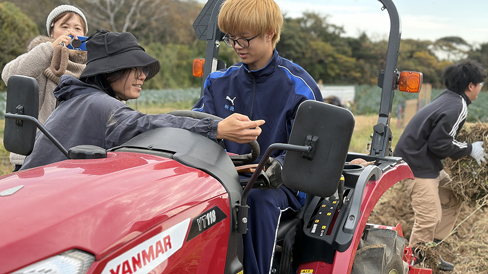 本日の作業は、畝を覆うマルチシート(黒ビニール)を剥がし、農耕機械で芋を掘り起こし、一面に張るツタを草刈り機で回収するという本格的な内容。特に鹿児島出身の新徳くんは、初めての農耕機械ライド(操縦)に挑戦し、目を輝かせながら操作を楽しんでいました。
