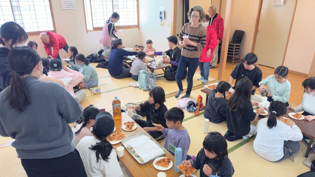 完成したピザと石垣まんじゅうを囲んで、みんなでいただきます!