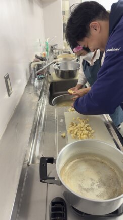 子どもたちが市民センターにやってくる前に、地域の方たちと学生で、今日の昼食の準備をします。お昼ご飯のメニューは、みんなで10月に収穫したサツマイモをつかった「石垣まんじゅう」(サツマイモ入りの蒸し饅頭)と「ピザ」です。「釣りが趣味なので、刺身なら作ることができるんだけど、野菜ははじめてで緊張する」と、ぎこちない手つきで切っていきます。