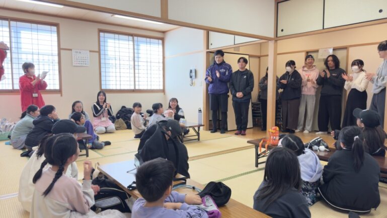 子どもたちが集まったら、大学生のお兄さん・お姉さんたちが自己紹介です。「今日はいっぱい遊ぼうね!」という声に、子どもたちからは「やったー!」と期待の声。和室いっぱいに笑顔が広がって、これからの時間がもっと楽しみになります。
