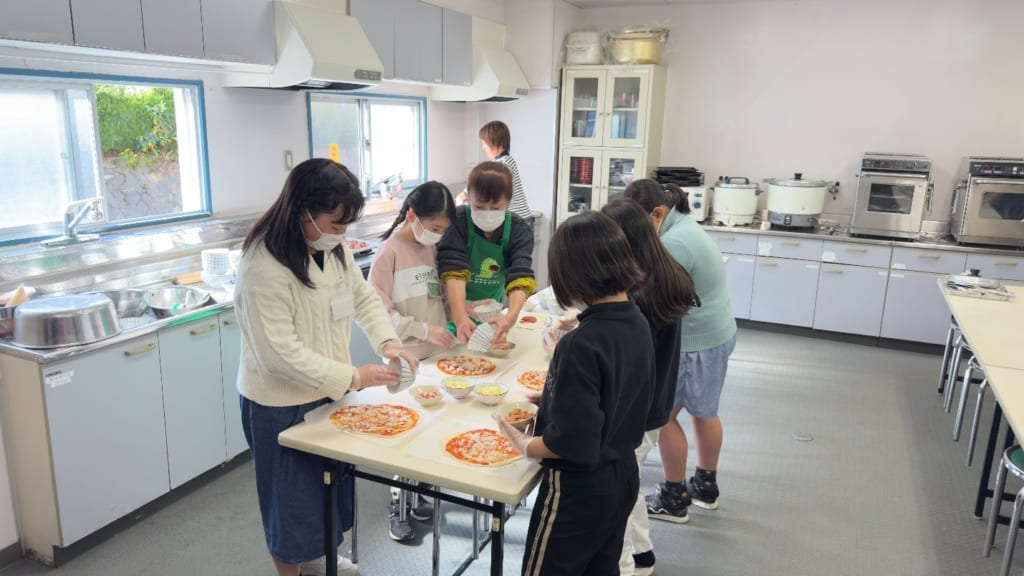 遊んだ後はお腹がペコペコ。今度はピザづくりにチャレンジです。地域の方と大学生が用意した生地に、子どもたちが好きな具材をトッピング。「チーズたっぷりにしよう!」、「ソーセージもいっぱい!」、「玉ねぎはいらな~い」と、真剣な表情で作業する子どもたち。自分だけのオリジナルピザが完成する瞬間はドキドキです。