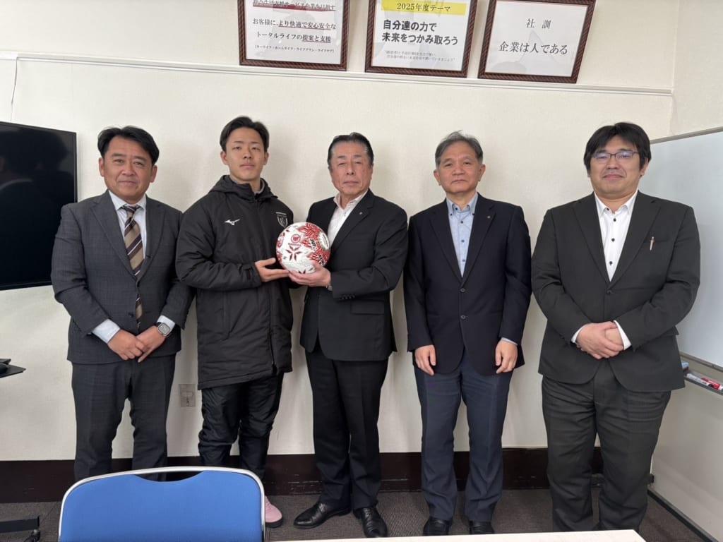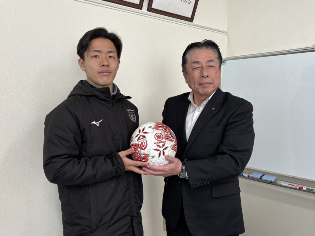 先日、株式会社ワシダ様よりサッカーボールを寄贈いただきましたので、主将の松尾と監督の籾井の2名がチームを代表して本社へお礼のご挨拶に行ってきました。