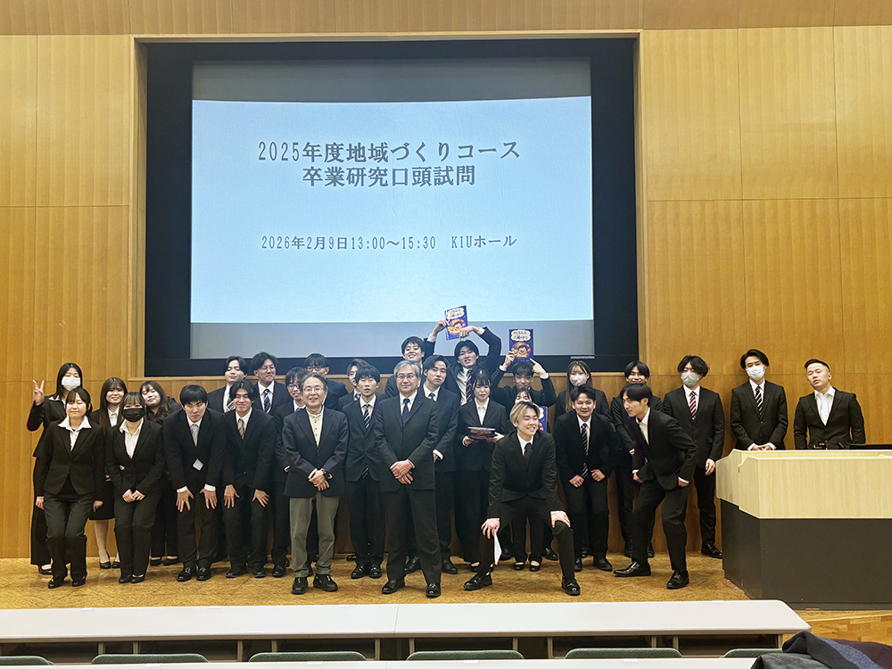 2026年2月9日、KIUホールにて2025年度地域づくりコース卒業研究口頭試問が実施され、三輪ゼミ、桒畑ゼミの6グループが卒業研究として取り組んできた共同プロジェクトの成果を報告しました。