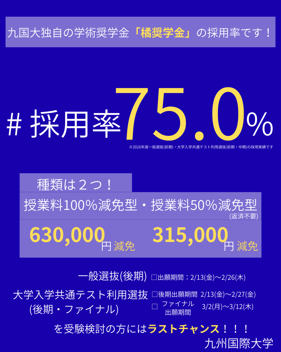 この驚異の数字は、九州国際大学独自の学術奨学金「橘奨学金」の採用率です。