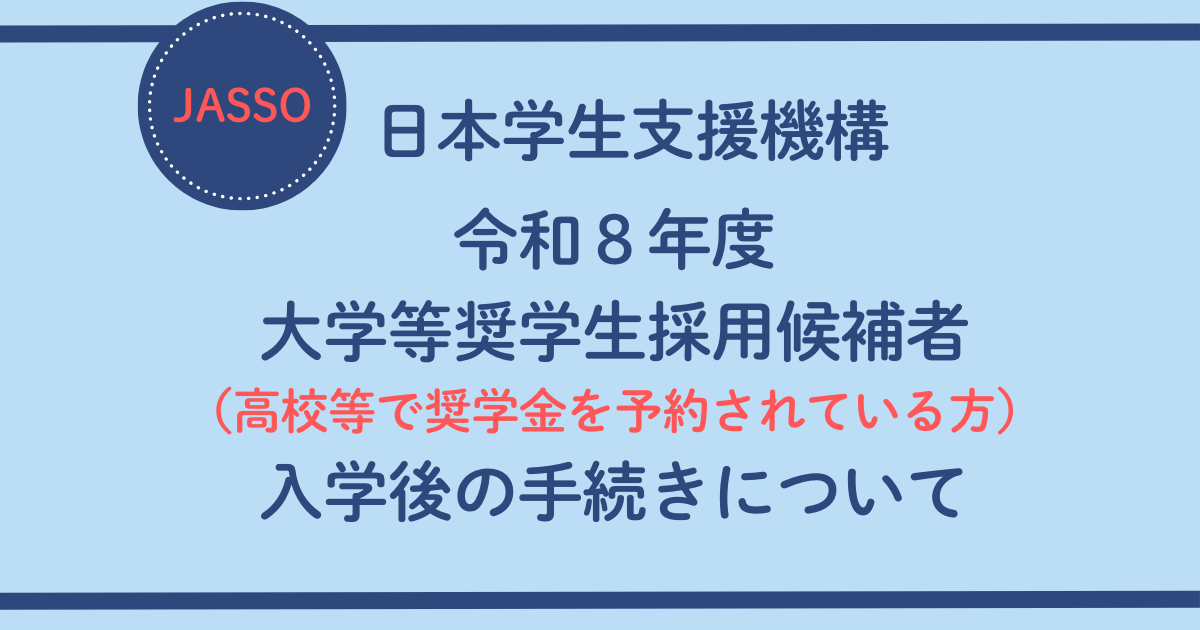 R8予約・入学後の手続アイキャッチ画像公開 2026年3月20日 寸法 1200 × 630 in 日本学生支援機構(JASSO) 令和8年度大学等奨学生採用候補者 (高校等で奨学金を予約されている方)の入学後の手続について.