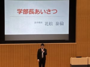 翌4月2日の入学式後に実施された学部ガイダンスでは、学部長あいさつにはじまり、学業面での注意点の説明や、4月3日のフレッシャーズ・ミーティングの案内がおこなわれました。