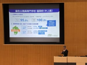 また、昨年度から稼働し始めたプログラム「スーパー公務員養成プログラム」の説明にあたり、法学部・キャリア支援室と連携する麻生教育サービスの担当者にご登壇いただき、現在の公務員試験をめぐる状況をご説明していただきました。
