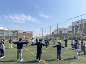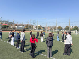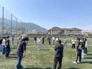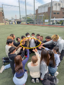 午前中はKIUフィールドでアクティビティを行いました。青空の下で体を動かすうちに、場の雰囲気も和らいでいきました。