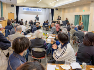 八幡東区の高見校区で毎年恒例の「高見の街に乾杯パーティー」に法学部花松ゼミが参加させて頂きました。高見地区で活動する様々な団体が年度初めに顔を合わせて一年間の活動を誓う決起集会で、八幡東区の区長や職員の方々、高見まちづくり協議会、社協、自治区会、幼稚園、PTAや小中学校の校長と先生方、地元スポーツクラブのコーチまで、80名にも及ぶ多種多様な方々と交流させて頂きました。花松ゼミは3年前から高見校区内の槻田第2自治区で開催されている「ミヤフェス」に参加させて頂いているご縁で、今回、高見まちづくり協議会会長の伊藤一義さんにお声掛け頂きました。