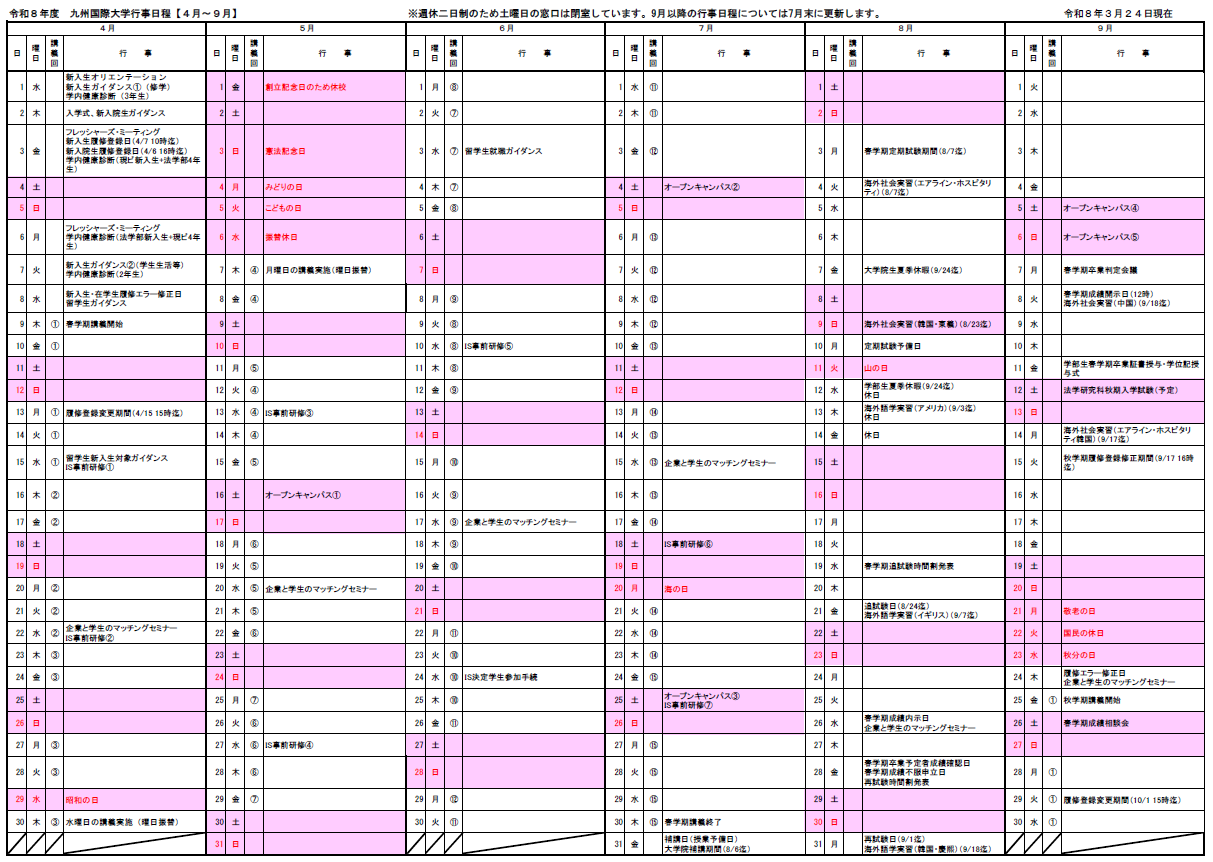 行事日程 事務窓口の利用時間 学生証 学費等 2026(令和8)年度 行事日程 行事の実施日時は予定であり、事情等により急きょ変更になる場合があります。学内行事に関する詳細な連絡事項については「KIUポータル」でも適宜通知されますので、併せてご確認ください。 ※クリックで拡大表示(PDF形式)