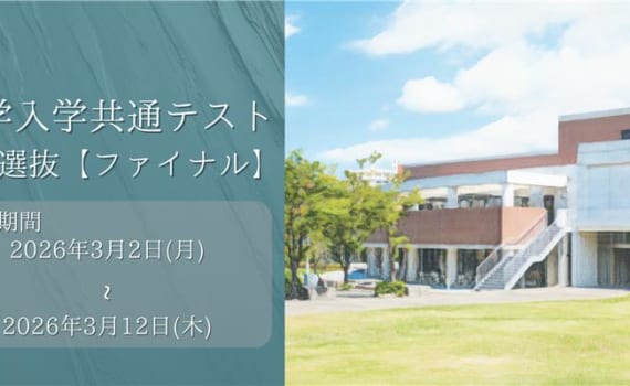 大学入学共通テスト利用選抜 (ファイナル) の出願受付が始まります 【出願期間】 共通テスト利用:3 [...続きを読む] 大学入学共通テスト利用選抜 (ファイナル) の出願受付が始まりました。27 2月, 2026 in 注目のニュース / イベント情報 / 入試・広報室より / お知らせ / Topics / ニュース / 入試広報室