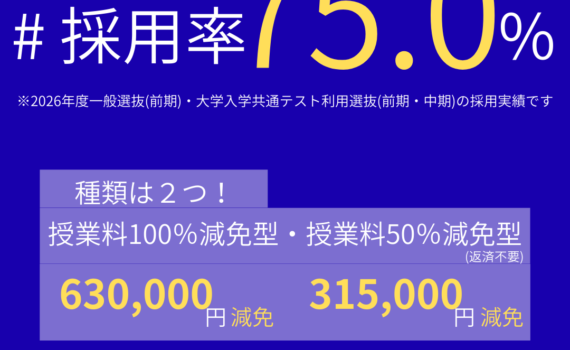 この驚異の数字は、九州国際大学独自の学術奨学金「橘奨学金」の採用率です。 種類は2つ! [...続きを読む] 受験生のみなさま!橘奨学金のラストチャンスです!24 2月, 2026 in 注目のニュース / イベント情報 / 入試・広報室より / お知らせ / Topics / ニュース / 入試広報室 / 未分類