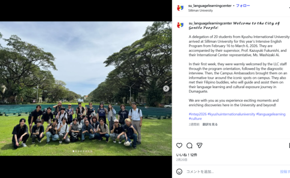 フィリピンへの海外実習を終えてみんな無事に帰国しました! 今年度の九州国際大学の海外実習プログラムは [...続きを読む] 【現ビ・国社】シリマン大学のインスタに掲載されました9 3月, 2026 in 注目のニュース / KIUブログ / 学生の活動紹介 / 現代ビジネス学部より / 国際センターより / 留学ブログ