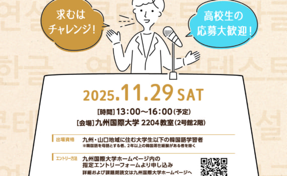 「第13回 KIUハングル・スピーチ コンテスト」を開催します。韓国語に興味がある。韓国語を学んだ。 [...続きを読む] 「第13回 KIUハングル・スピーチ コンテスト」出場者募集!7 10月, 2025 in 注目のニュース / イベント情報 / 国際センターより / 現代ビジネス学部 ハングルコース / お知らせ / Topics