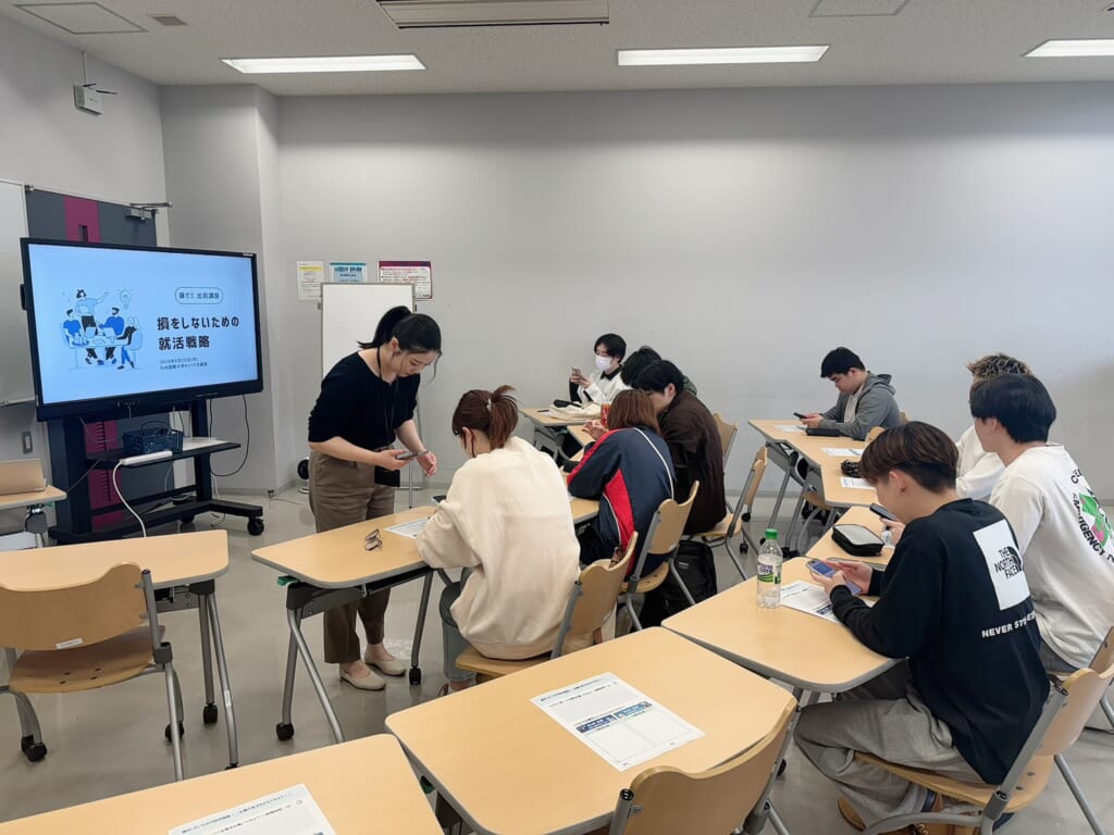 今回は九州国際大学の卒業生でもる中本が、キャリア支援室の職員としてだけでなく、「九国大の先輩」として講座を行いました!