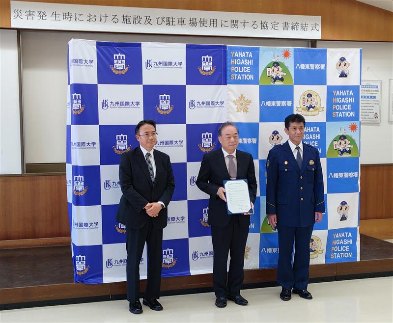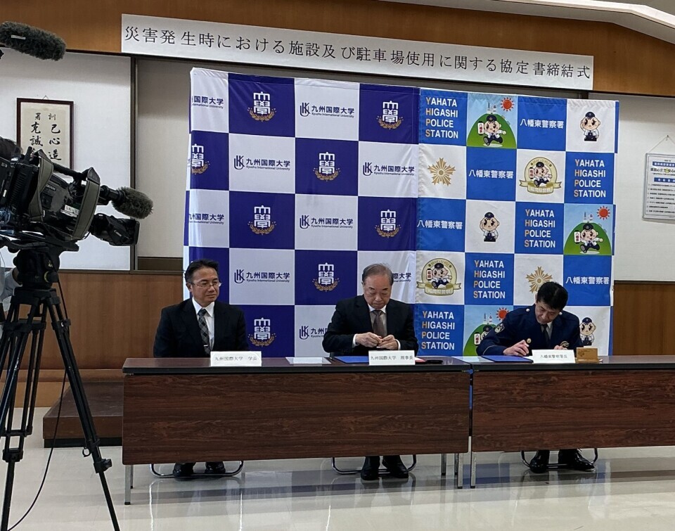 11月11日(火)、学校法人九州国際大学と福岡県警察八幡東警察署との間で「災害時における施設及び駐車場使用に関する協定書」締結式が執り行われました。